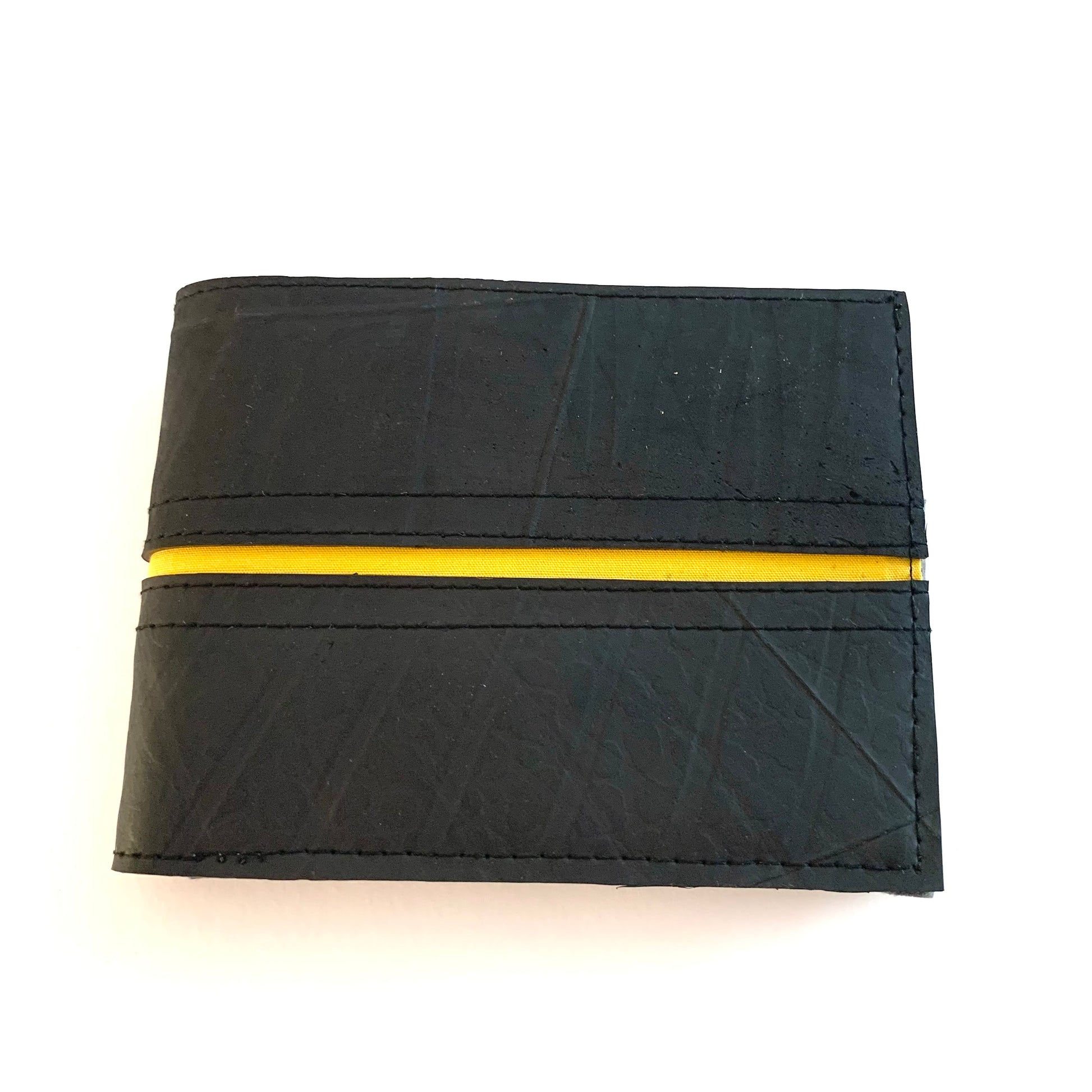 Our environmentally-friendly bifold wallet is made from reclaimed tire inner tubes and features a pop of color on the exterior. Several slots for ID/cards and two compartments for bills.