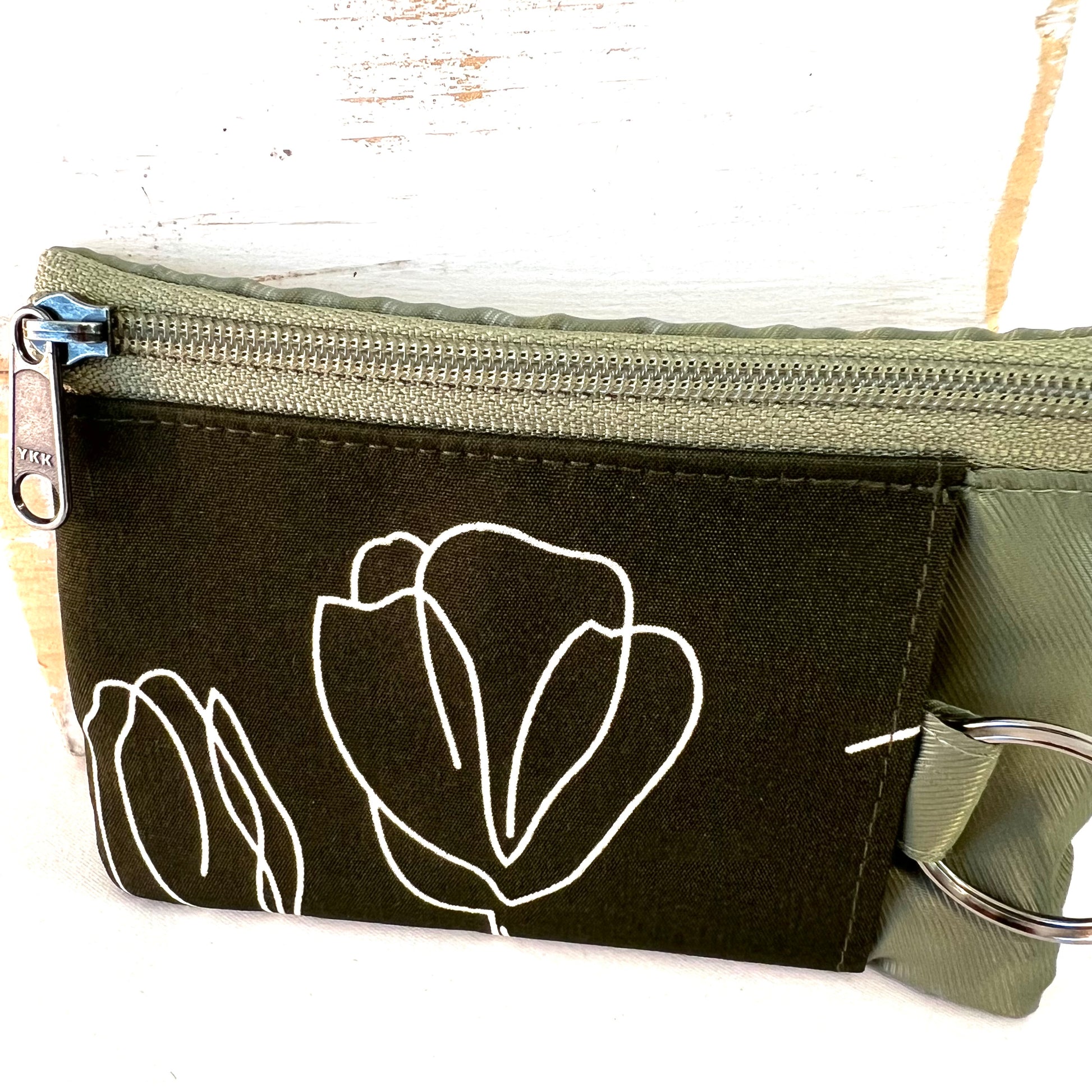 Our Minimalist Wallet is made from lightweight nylon fabric and has 2 zippered compartments on opposite sides. It has a divider for your ID and a keychain to attach your keys or keyfob and tuck it into the pocket.