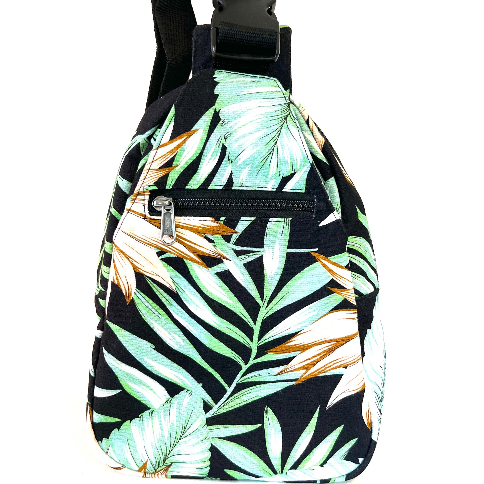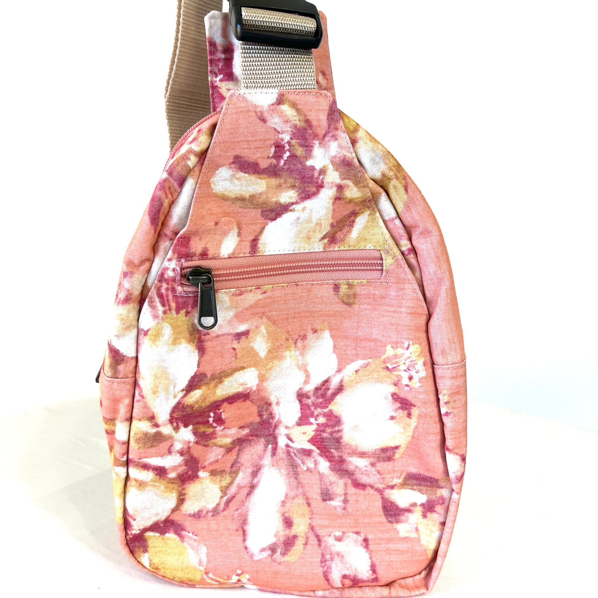 Somon's little girl, Rosa, is all grown up! Rosa is our newest sling backpack. It is a smaller size, but has the same functions as our Somon sling backpack. Outside it still has a large zippered compartment, front zippered pocket, large clipped pocket (big enough for a 32oz water bottle) and back zippered pocket. A zippered pocket and open pocket reside in our classic interior.