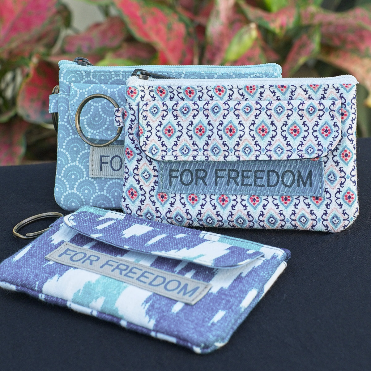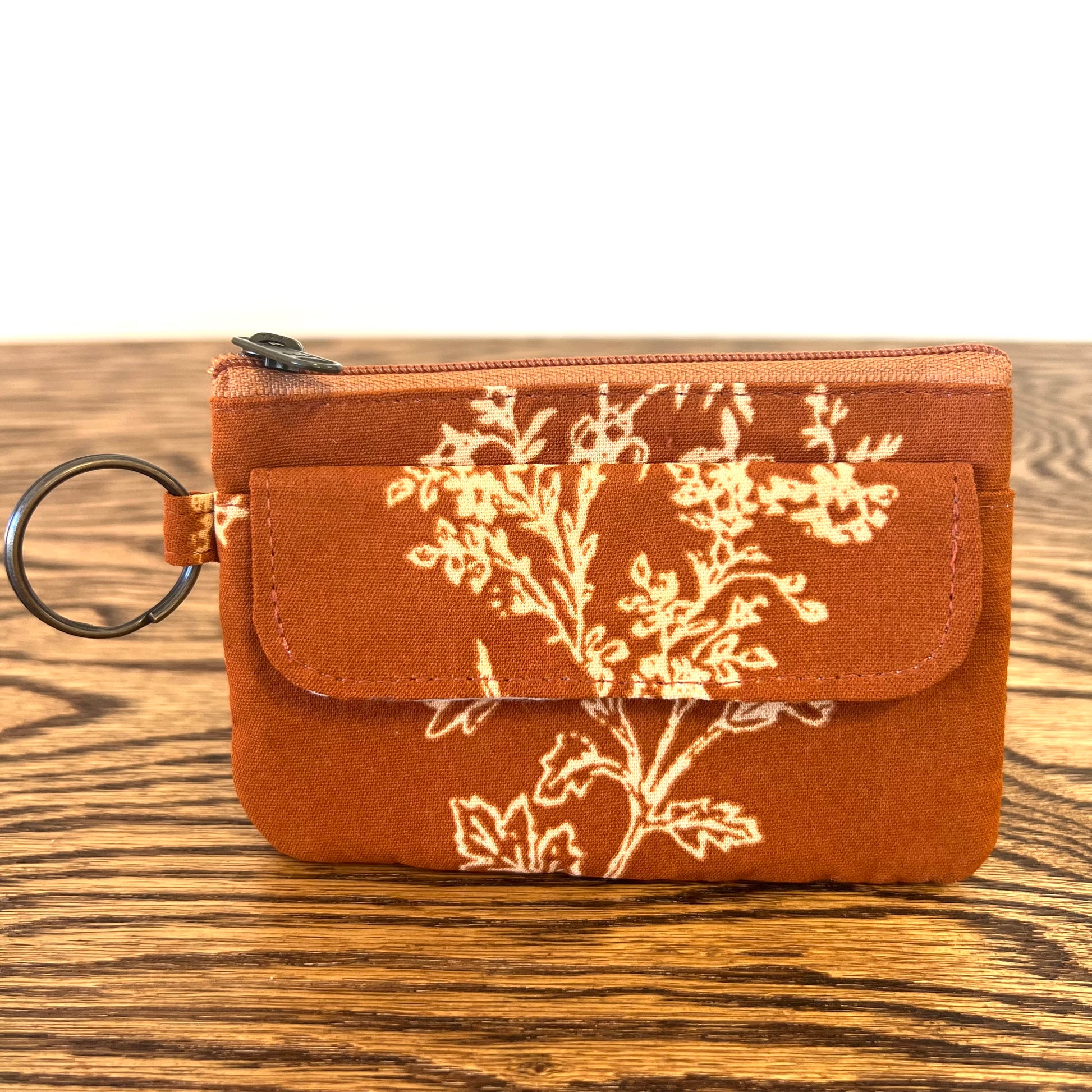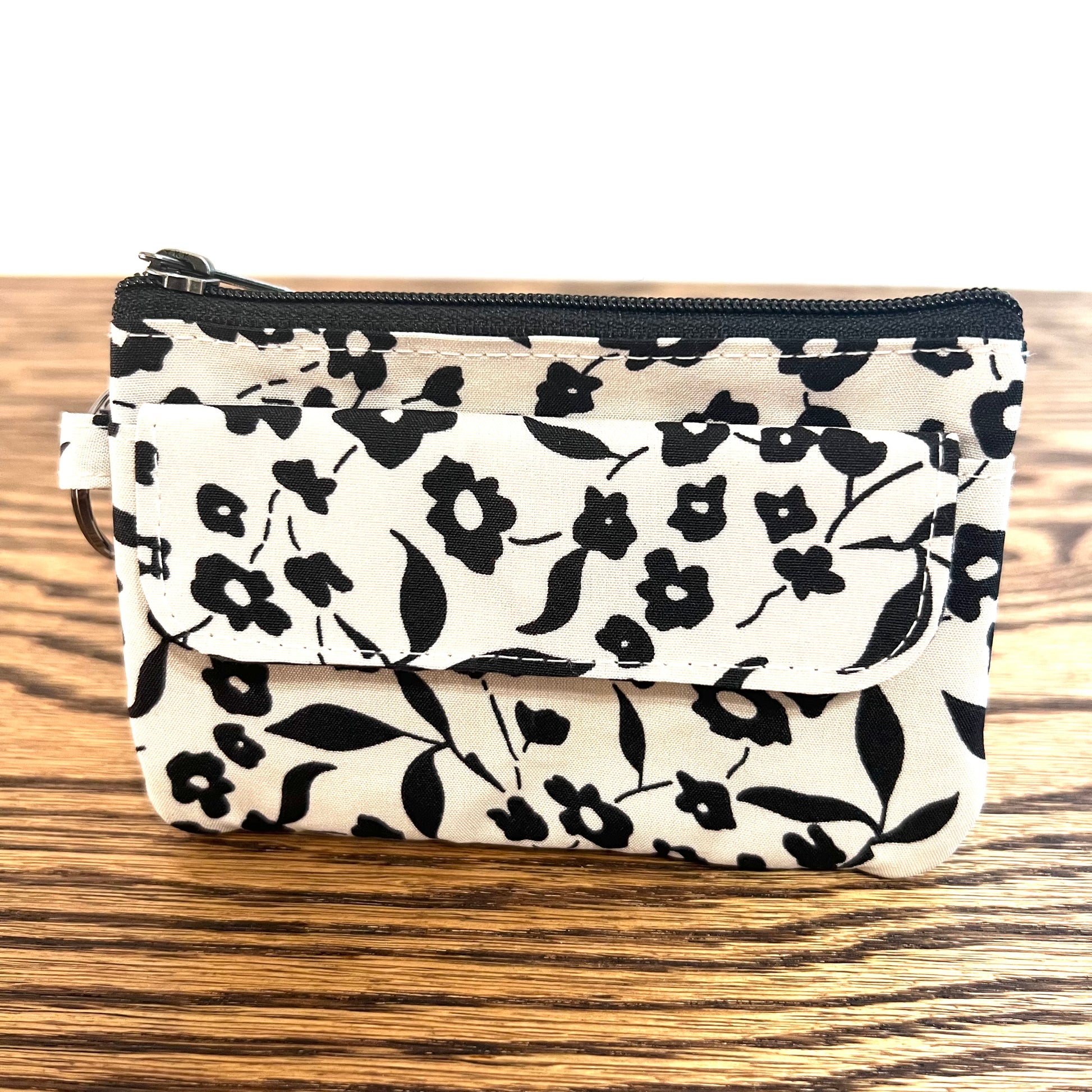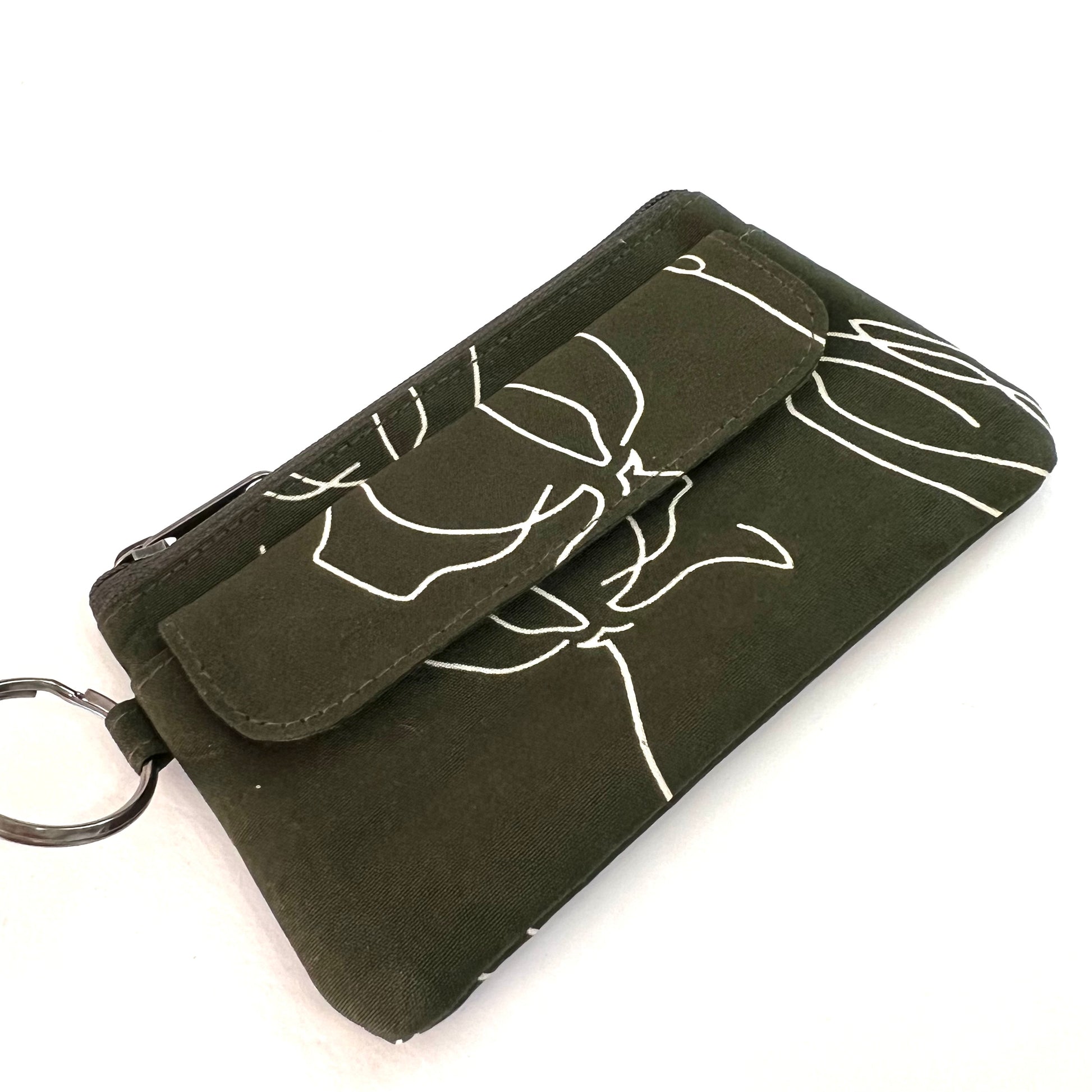 This much loved mini wallet features an exterior plastic window with divider for your driver’s license or ID. On the reverse side another snap closure pocket. A key ring attached for your keys or a keychain.