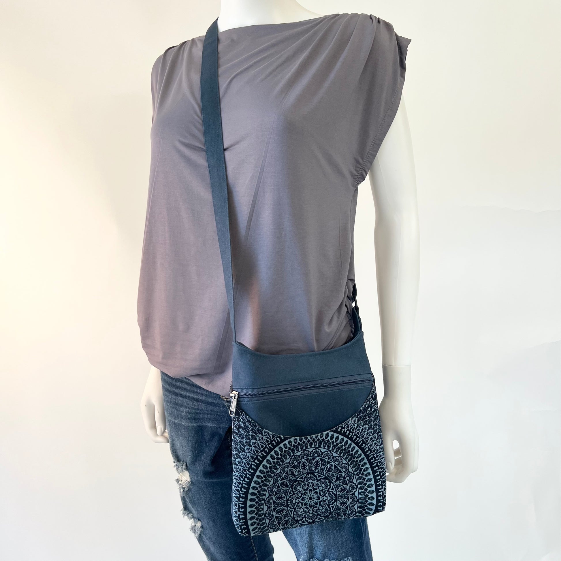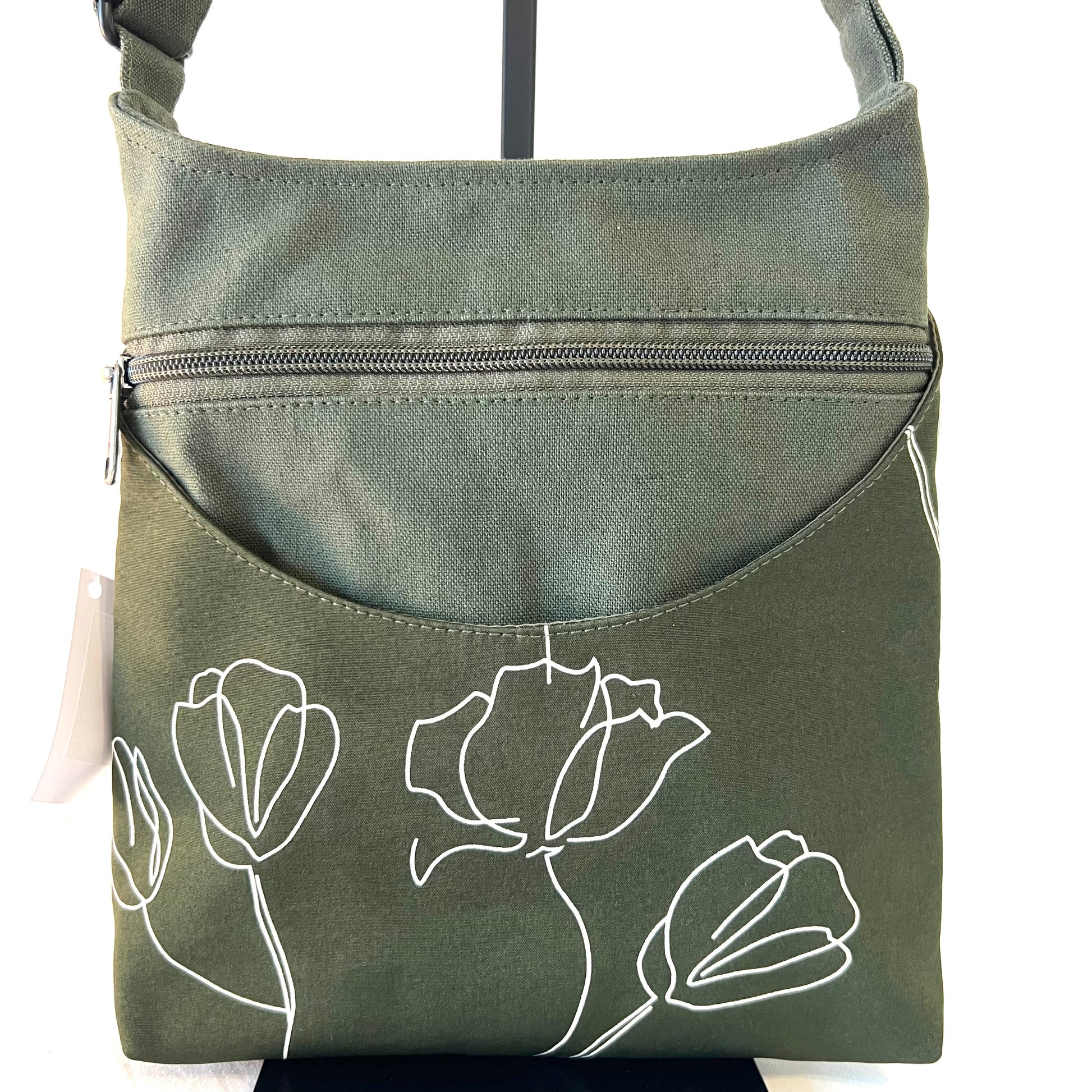 Our Toun bag has gone through a redesign. It has a wider base and a curved top to allow for easier access to your items along with an addition of a back zippered pocket. Toun is a medium sized, zip-top cross body/shoulder bag that has a signature curved front pocket along with front and back zippered pockets. Inside you'll find our standard interior with 2 open pockets and 1 zippered pocket.